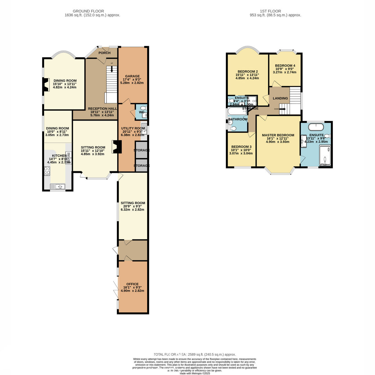 The principal suite boasts a large bay window overlooking the garden and a luxurious en-suite bathroom, stylishly updated with a walk-in shower, free-standing bath, modern sink unit, WC, and heated towel rail.