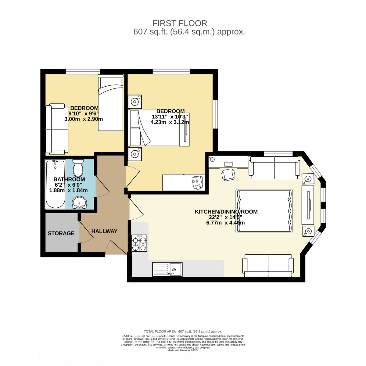 This first-floor flat is tastefully decorated and features two double bedrooms. The bright and airy open-plan kitchen, lounge, and dining area benefit from a dual aspect, ensuring plenty of natural light. The kitchen is equipped with modern cabinets, an integrated oven, a hob with an overhead extractor, and a fridge/freezer. There is also space and plumbing for a freestanding washing machine.