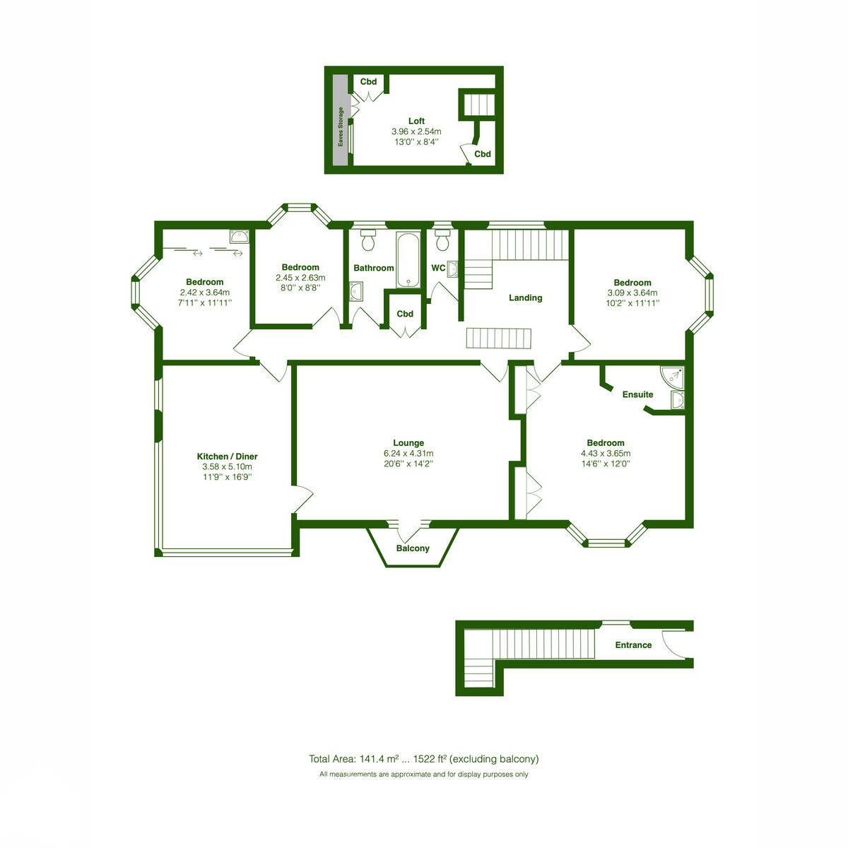 Accessed via a private entrance, the first-floor accommodation includes a large landing with a feature window, leading to all rooms and a partially converted loft. The living room is generously sized, accommodating multiple pieces of furniture, and features an inset log burner with storage below and shelving on either side. A UPVC door with matching side windows opens onto a small balcony.