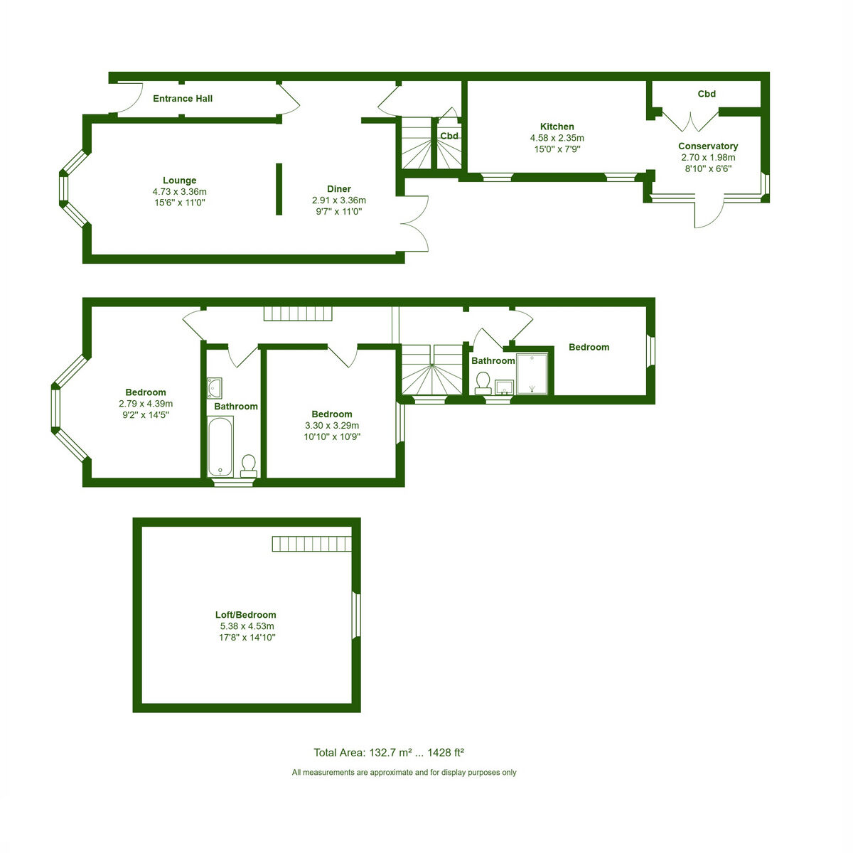 Going into the kitchen, you'll find that it has been finished to a high standard, with white finishes and wooden countertops. The kitchen is well equipped with white units, solid wooden countertops, and a butler sink. It is fitted with a washing machine, a range cooker, and an integrated fridge freezer. Another tasteful feature of this kitchen is the barstool seating at the end, making it a more social space. At the end of the kitchen, you'll find a conservatory with a utility space in the cupboards. The conservatory leads straight onto the garden and has no shortage of light flowing through. Going upstairs, to your right you'll find a double bedroom and a bathroom. The bathroom is modern and is fitted with a large shower. To the left is the master bedroom, which has a fantastic window seat that overlooks the garden, the perfect suntrap with a view! Next is the family bathroom, which is large and fitted with a bath. At the end of the passage is the third double bedroom which is very bright. Going into the loft space, you'll find that is being used as a forth bedroom . This room is very big and well-equipped with storage.